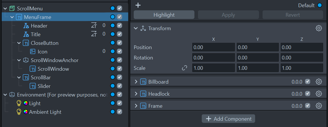 The MenuFrame component contains the Frame script showing the UI canvas, as well as the HeadLock and the Billboard script keeping the UI more or less in view.